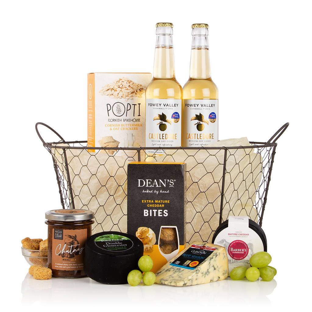 If your recipient is sweet enough already, why not treat your special someone to the Cider & Cheese Gift. Presented in an attractive wire basket, this mouth-watering delight cannot fail to impress any cheese lover!  Only the very finest cheeses have made the grade, which partnered with Popti Cornish Buttermilk & Oat Crackers and two bottles of Fowey Valley craft cider creates an ideal gift for those that love their cheese and cider! We have included a duo of waxed cheeses which include the tangy double Gloucester with chives and spring onions and the classic Barber’s Farmhouse Mature Cheddar. Of course, no cheese hamper would be complete without chutney, and we have selected the very finest Real Ale Chutney handcrafted in Devon.  Your lucky recipient will be all set for a delicious picnic or perhaps they could bring it out for the perfect after dinner cheese board. Whether you’re buying for dear friends and family, employees or a valued client this exceptional gift will be very well received.  For full allergen and product ingredient information, please click the PDF link.  Gift Dimensions: W:280mm H:246mm D:431mm FRESH FOOD HAMPERS Fresh food hampers must be signed for upon delivery. Please ensure that your recipient will be available to receive the goods on the chosen delivery date, as we cannot guarantee that these products will still be consumable if we are unable to complete first time delivery. All fresh food needs to be opened and refrigerated within 48 hours of despatch to ensure that the contents remain safe to consume. We are unable to offer product or delivery refunds for failed fresh food deliveries that are due to the recipient not being at home or due to us having been provided with an incorrect delivery address. Fresh Food gifts can only be delivered on a Tuesday through to Saturday as we cannot guarantee to our satisfaction gifts will remain cold whilst in transit over a weekend. We do not send fresh food items to Highlands, Islands or Overseas addresses as we cannot guarantee that they will remain cold during the longer travel times.